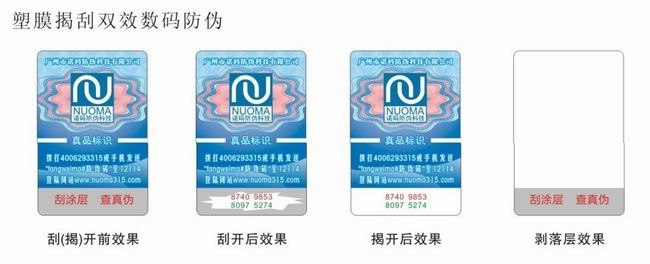 4、 隱形激光塑膜揭開式,特點(diǎn):可在標(biāo)識(shí)上面加印防偽技術(shù)如熒光、 雙卡、 微 縮 、個(gè)性化扭索團(tuán)花等。個(gè)性化扭索團(tuán)花具有較高的防偽功能,復(fù)雜、 多邊及嚴(yán)謹(jǐn)?shù)木€條組合令普通的防偽軟件難以模仿。激光隱形圖案具有較高的防偽功能,是采用光學(xué)原理隨機(jī)生成,從不同角度觀看呈現(xiàn)多種動(dòng)態(tài)色彩。